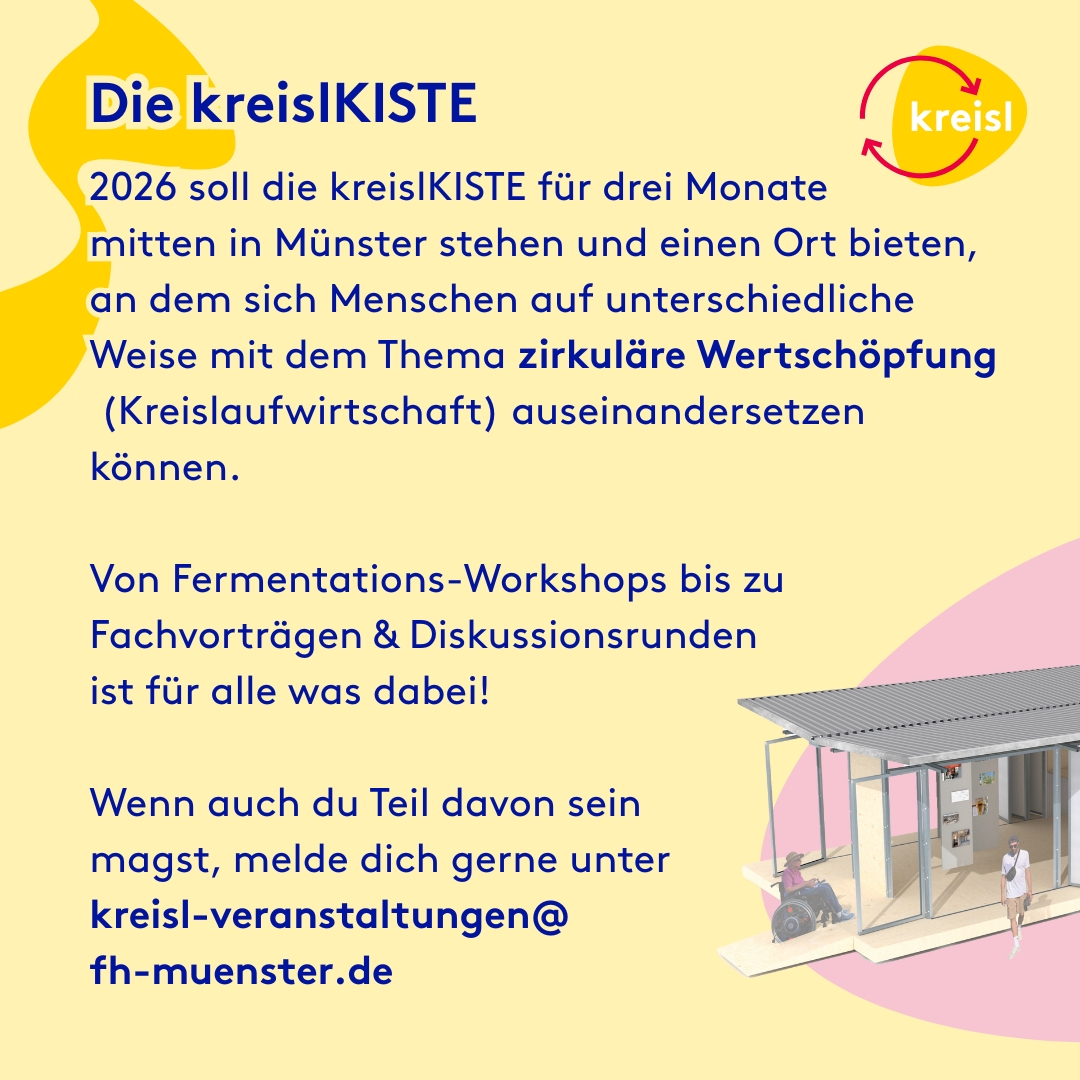 Mit der kreisl Kiste entsteht 2026 mitten in Münster ein Raum, in dem Hochschule, Wirtschaft und Gesellschaft gemeinsam an Lösungen für eine lebenswerte Zukunft arbeiten – zum Diskutieren, Ausprobieren und Mitgestalten. Mit dem Projekt kreisl wird auf dem Domplatz ein attraktiver Begegnungs- und Experimentierraum geschaffen, in dem Studierende verschiedener Fachrichtungen durch aktive Mitgestaltung zirkuläres Wirtschaften erfahren, verstehen und umsetzen können.