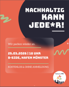 Die Initiative futuroMS lädt am 25.03 um 18 Uhr in die B-Side am Hafen ein. Auch dieses Mal gibt es wieder einen spannenden Input: #gruenstattgrau informiert über das Thema Abpflastern bzw. die Entsiegelung von Flächen. Danach widmen wir uns euren favorisierten Themen „Nachhaltiges Reisen“ und „KI und Nachhaltigkeit“.
